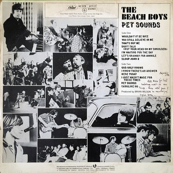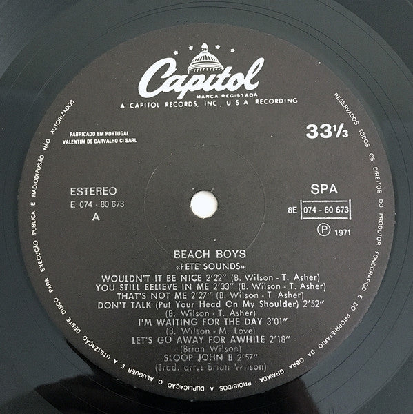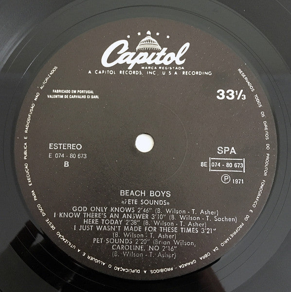 Album title misspelled as "Pete Sounds" on labels. First #cat. in backcover. Second #cat. on labels. Manufactured and distributed by Valentim de Carvalho, Comércio e Indústria, S.A.R.L. In Association with The Gramophone Company Ltd. - Hayes - Middlesex - England