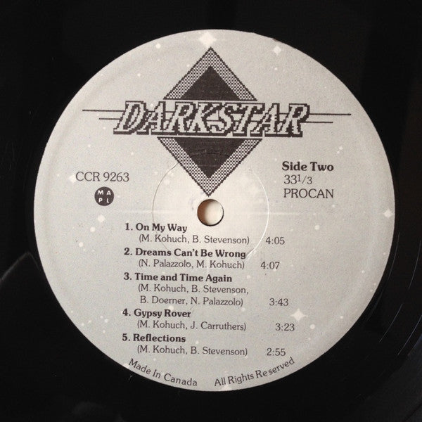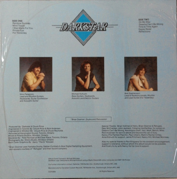 Other information on back of outer sleeve: Recorded at Kensington Sound, Toronto, Ontario Mixed at Polaris Studios, Windsor, Ontario * Brian Doerner uses Yamaha Drums, Sabian Cymbals & Akai Digital Sampling Equipment, and appears courtesy of "Refugee" and their record company. Special thanks: Brian Vollmer of Helix, Brian Doerner & Refugee, Gary McCracken, John Jackson, Yhanna VanDerKley, for vocals on Dreams Can't Be Wrong, Kensington Staff, Vezi, Mark, Bertch, Mike. Rick Andersen for service above and beyond the call of duty. Kenny (The Farmer) Paschin, Paul Urbano, Mark & Rachel Crilley, Anne Kohuch for support, Jamie Pritchard, Nancy Hill, Michael Morneau. Also my special thanks to Ron Kingyens for his constant encouragement, support & tolerance, without whom this album would not be possible. And finally to my wife Nancy for her love & support. DarkStar Logo: Designed using a Radio Shack 64K colour computer and DMP-105 Printer. For further information contact: Darkstar, 749 Warden Ave., Scarborough, Ontario, M1L 4A8 Manufactured by Canadian Custom Records, 749 Warden Ave., Scarborough, Ontario, M1L 4A8 CCR 9263 All Rights Reserved