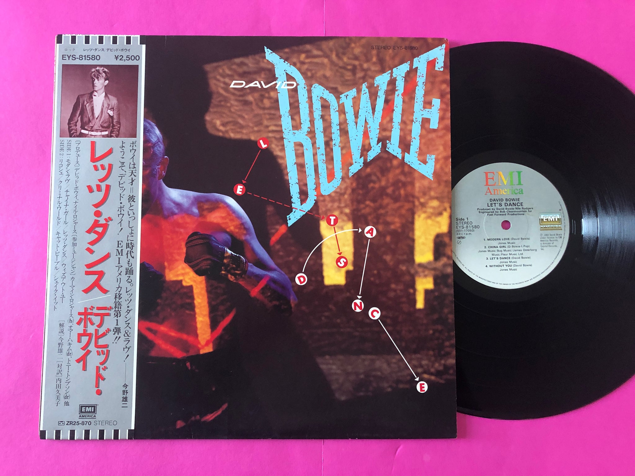 Publishing: A1 © 1983 Jones Music ASCAP A2 © 1977 Bug Music/James Osterberg Music/Jones Music/Fleur Music Ltd. BMI A3 © 1983 Jones Music ASCAP A4 © 1983 Jones Music ASCAP B1 © 1983 Jones Music ASCAP B2 © 1978 Logo Songs Ltd. Canada Administrated by The Hudson Bay Music Company BMI B3 © 1982 MCA Music. A Division of MCA, Inc./Music Corporation Of America, Inc., New York, New York B4 © 1983 Jones Music ASCAP Omar Hakim appears courtesy of Columbia Records Bernard Edwards appears courtesy of Atlantic Recording Corporation Nile Rodgers appears courtesy of Atlantic Recording Corporation ‘Mfd. by Toshiba-EMI Ltd. in Japan. Under License from Capitol Records Inc.’ appears on the center labels ‘© 1983 David Bowie ℗ 1983 David Bowie under license to EMI America Records, a division of Capitol Records, Inc.’ appears on the inner and outer sleeves Includes Japanese liner notes/lyrics and printed inner sleeve. ¥2,500