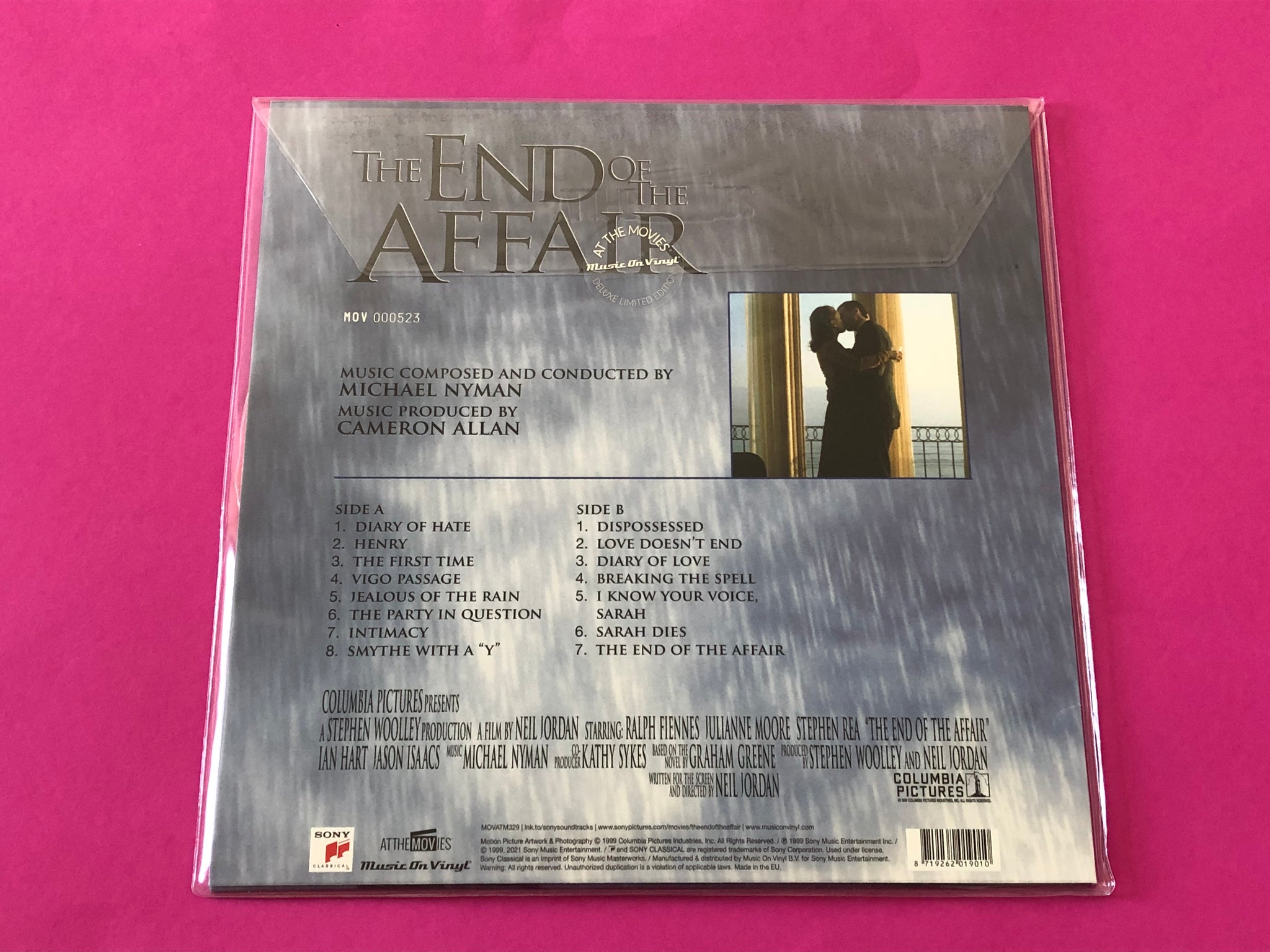 180 gram audiophile vinyl Heavyweight sleeve with deluxe soft-touch laminate finish PVC protective sleeve with large hype sticker Includes an insert Available on vinyl for the first time Limited edition of 1000 individually numbered copies on flaming coloured vinyl Edition number is foil stamped (silver) on back cover. A-side label omits track 8 'Smythe With A "Y"', yet it is featured on the record and mentioned in the track list on the back cover. Music composed and conducted by Michael Nyman (The Piano, Gattaca a.o.) Romantic drama film written and directed by Neil Jordan starring Ralph Fiennes, Julianne Moore and Stephen Rea Based on the 1951 novel by British author Graham Greene