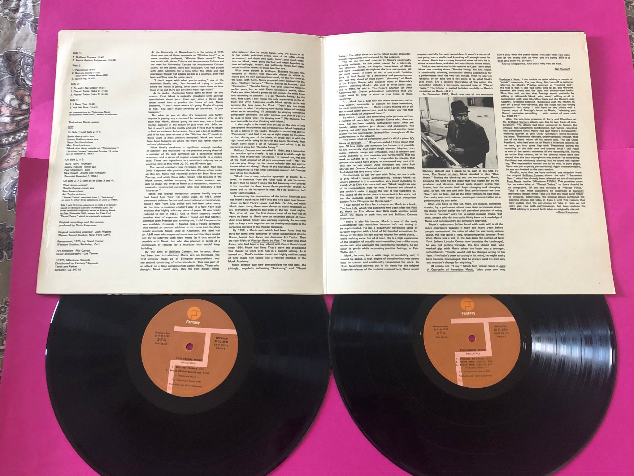 Gatefold cover. Side A and first two tracks on side B originally issued on "Brilliant Corners" (Riverside 226). B3, side C and side D originally issued as "Five By Monk By Five" (Riverside 305), Except for C2 which is previously unissued. Recorded at Reeves Sound Studios, New York City. Remastered at Fantasy Studios, Berkeley, Ca. All tracks published by Thelonious Music-BMI except B2 by Bayes Music-BMI © & ℗ 1975 Milestone Records Fabricado e distribuído em Portugal por Rádio Triunfo Lda.