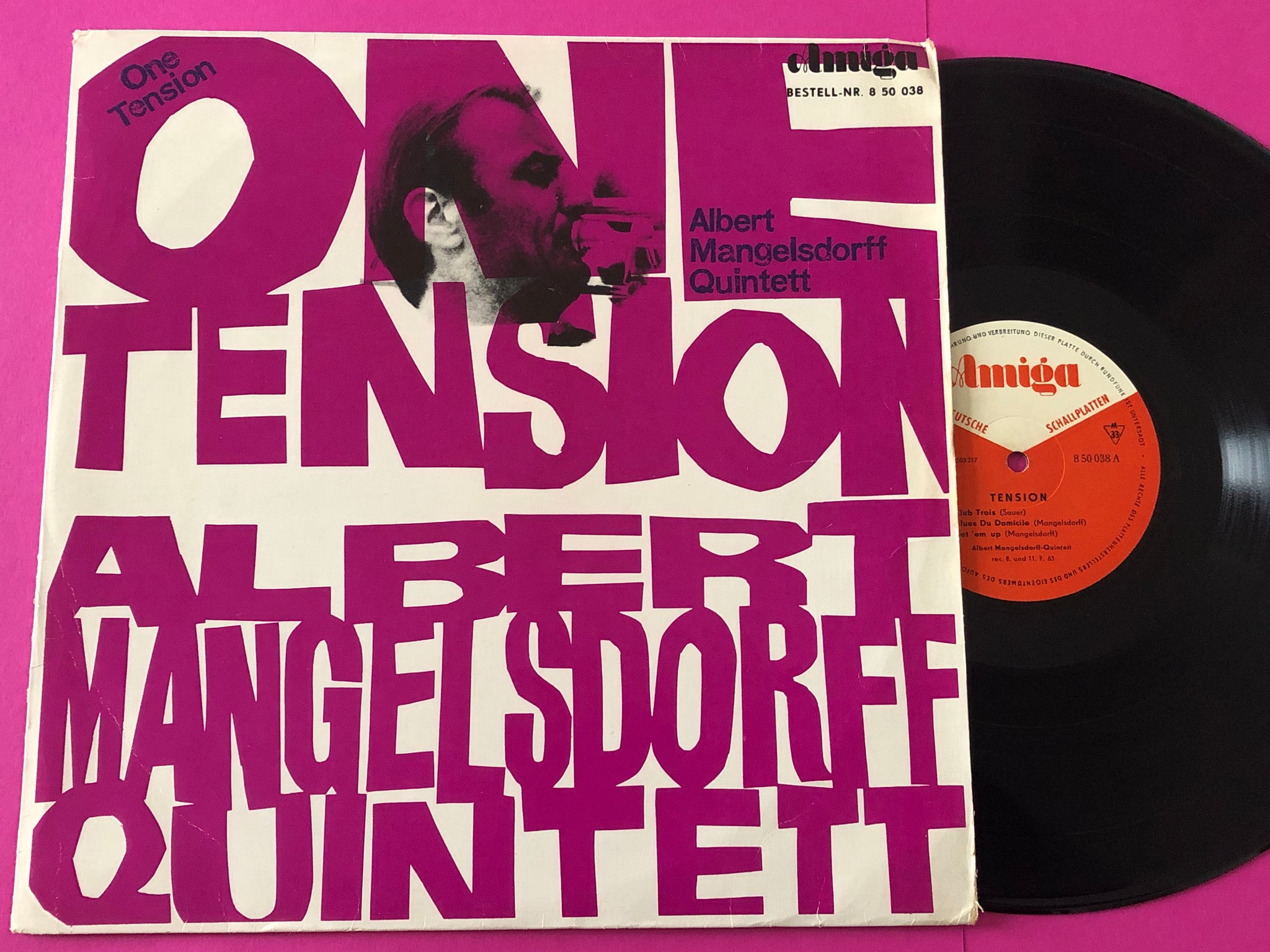 Original East German (GDR) edition. Released 1965 Named incorrectly "One Tension". "Tension" was the correct title as this was originally number one in a series of 4 German CBS trifolds released 1963/4. But even on the original release [r=1324486 they didn't get it right. Recorded July 8 & 11, 1963, Frankfurt am Main. "I" and "X" in runouts are rotated 90° to the left.