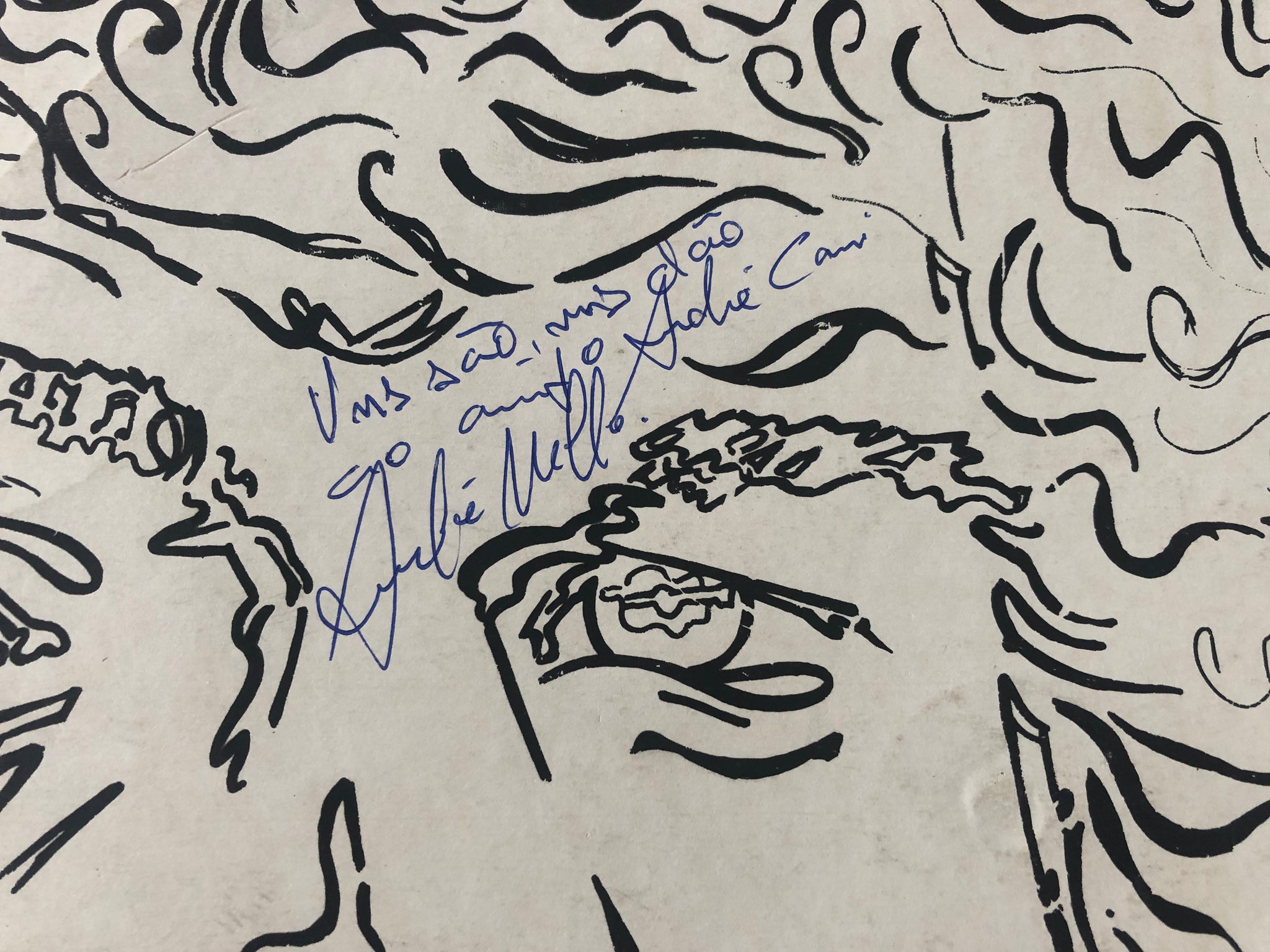 Awesome and under the radar gem from Brazil, synth tropical vibes, quite unique. This copy is SIGNED by André Melo on the sleeve. Record is very clean, grades NM though there is a little bit of background noise at te beginning of each side and between tracks, i'm pretty sure this is the pressing. Sleeve in nice VG+ with small cuts on the top opened edge from where the record gets inserted. Also included a foldout insert. Rare