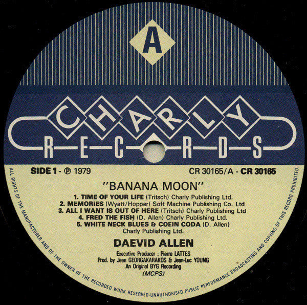 Pale green, blue and white labels with black text. Recorded January February 1971 An Original BYG Recording "Codein Coda" is listed as track 6 on the cover, but is actually the end of track 5, consisting of tape loop experiments ending in a locked groove. Track info on label with a typo: "5. White Neck Blues & Coein Coda". A1 track title on label: "Time Of Your Life" A4 track title on label: "Fred The Fish" B2 track title on label: "& His Adventures In The Land Of Flip" Similar to [r6857352, which has the older cartoon labels.