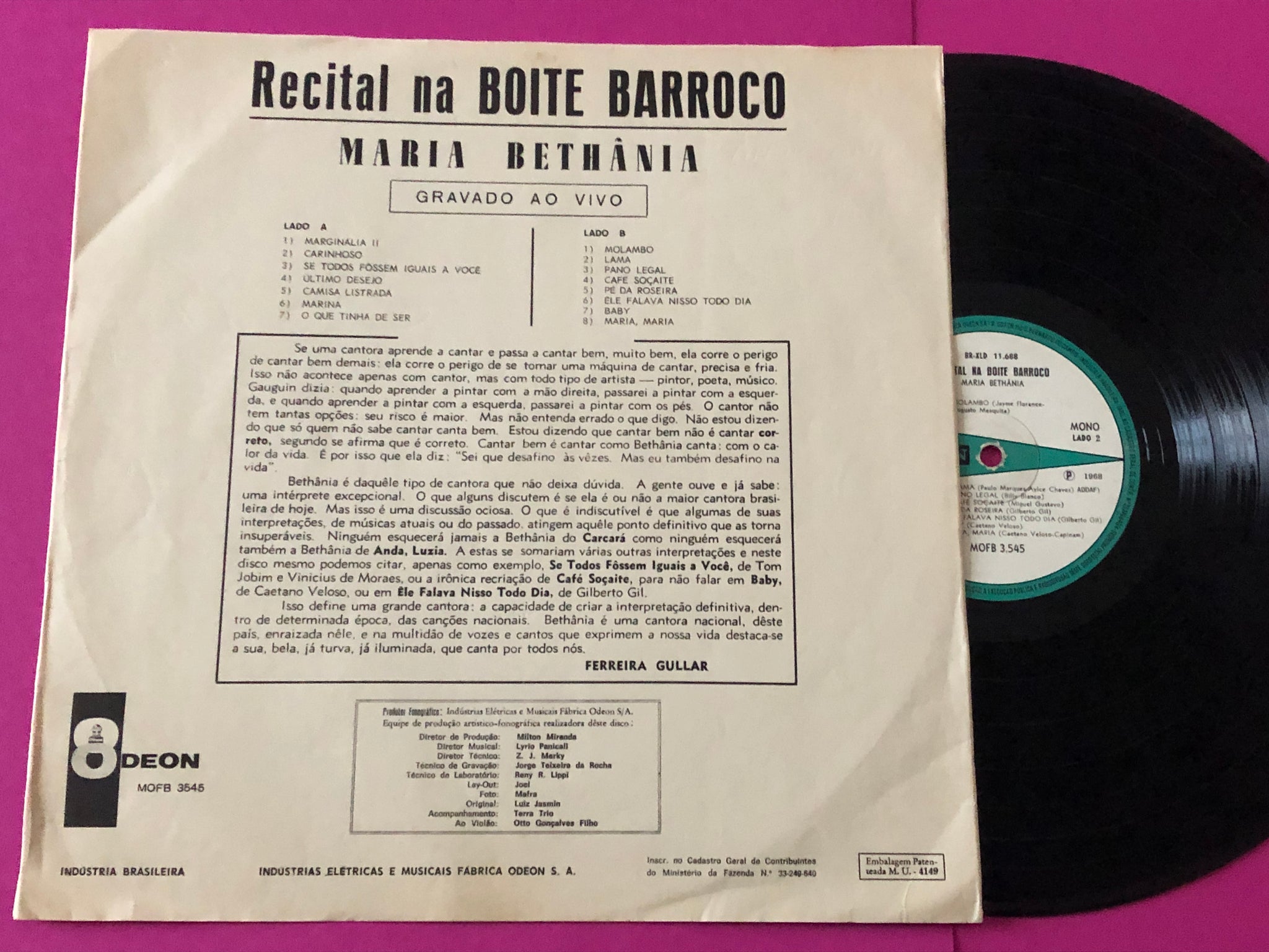 Comes in a plastic 'sandwich' type cover. Recorded live at "Boite Barroco" (Copacabana, Rio de Janeiro) during the four month tenure Maria Bethânia had at the club between the 29th of April and July 1968.
