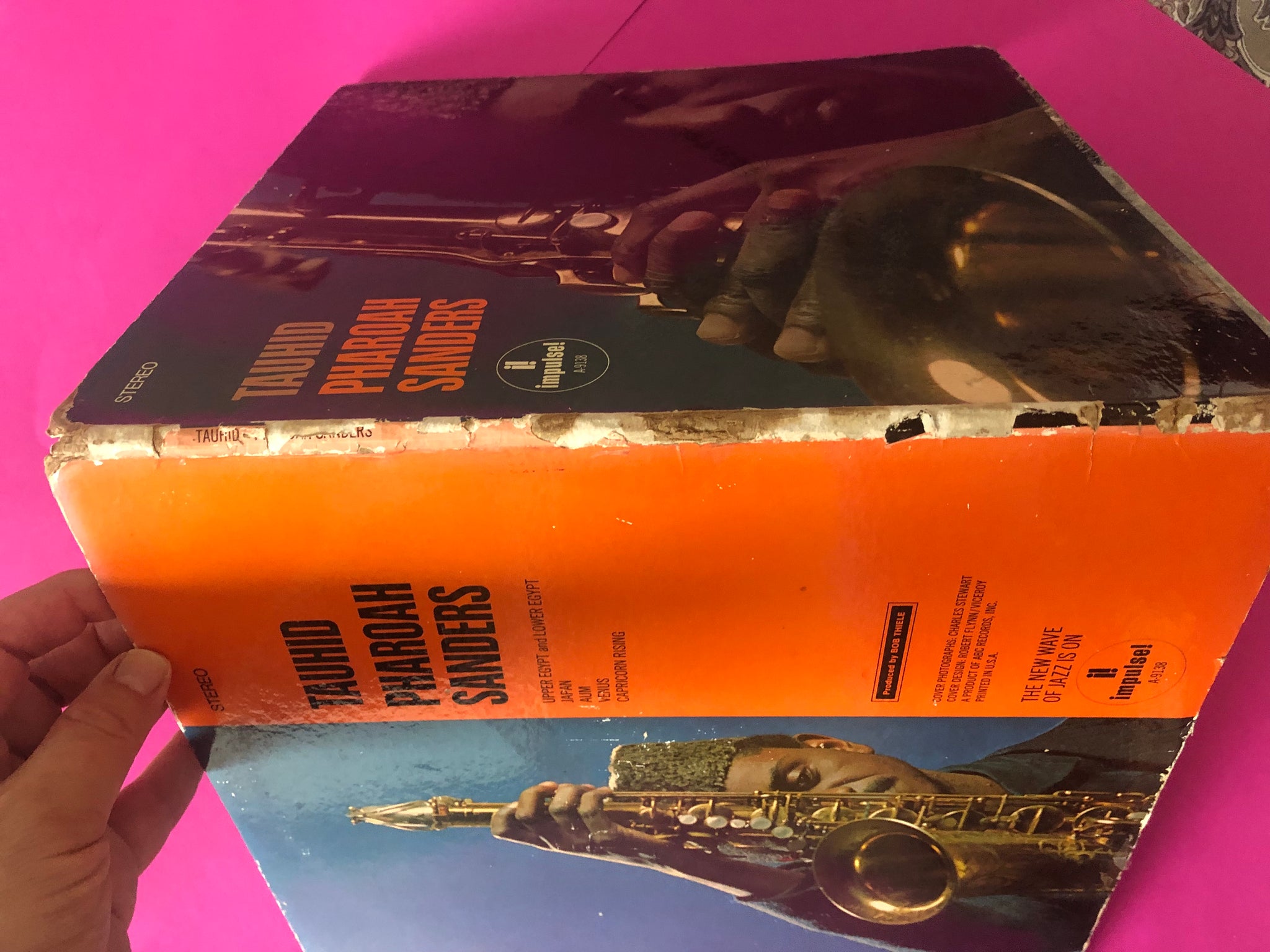 Garanteed 1967 1st pressing with Van Gelder matrixes, Orange & Black Impulse labels. Record with several surface marks,none deep. Incredibly the record plays through without problems like skips or jumos of the needle. Plays through with surface noise but still a listenable record. Spine is almost gone with wear and there is general age wear on the sleeve. This record was purchased by me in a Cairo bazar. There is some Arabic handwritten text on the inner gatefold.