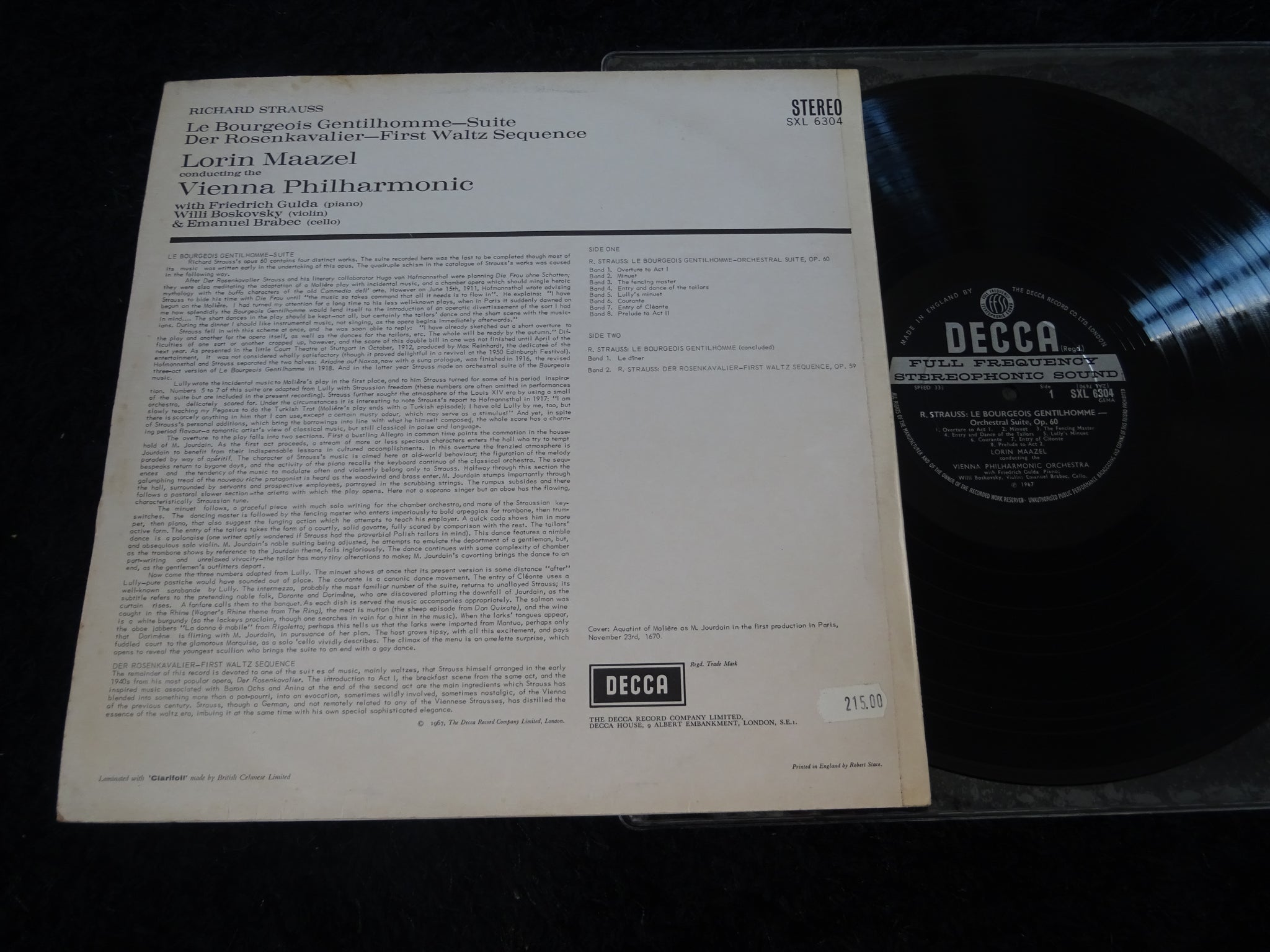 This is the first UK version for this cat#. This LP was most probably not released with the ED1 label. LABELS: - Black/silver 'grooved wideband' labels - "MADE IN ENGLAND BY" at 11 o'clock - "S" to the left of spindle hole - "℗ 1967" - Matrix numbers printed upside-down SLEEVE: - Front laminated - No flipbacks - Bold "STEREO" on spine - "Cover: Aquatint of Molière as M. Jourdain[..." - "© 1967, The Decca Record Company Limited, London." - "Laminated with 'Clarifoil' made by British Celanese Limited" - "Printed in England by Robert Stace." - Uncredited sleeve notes in English only on back PUBLISHER: - "Boosey & Hawkes" applies to track B2 only OTHER INFORMATION: - Recorded 6 - 10 October 1966 in the Sofiensaal, Vienna - Labelography code: ED2 - Corresponding mono issue has cat# LXT 6304