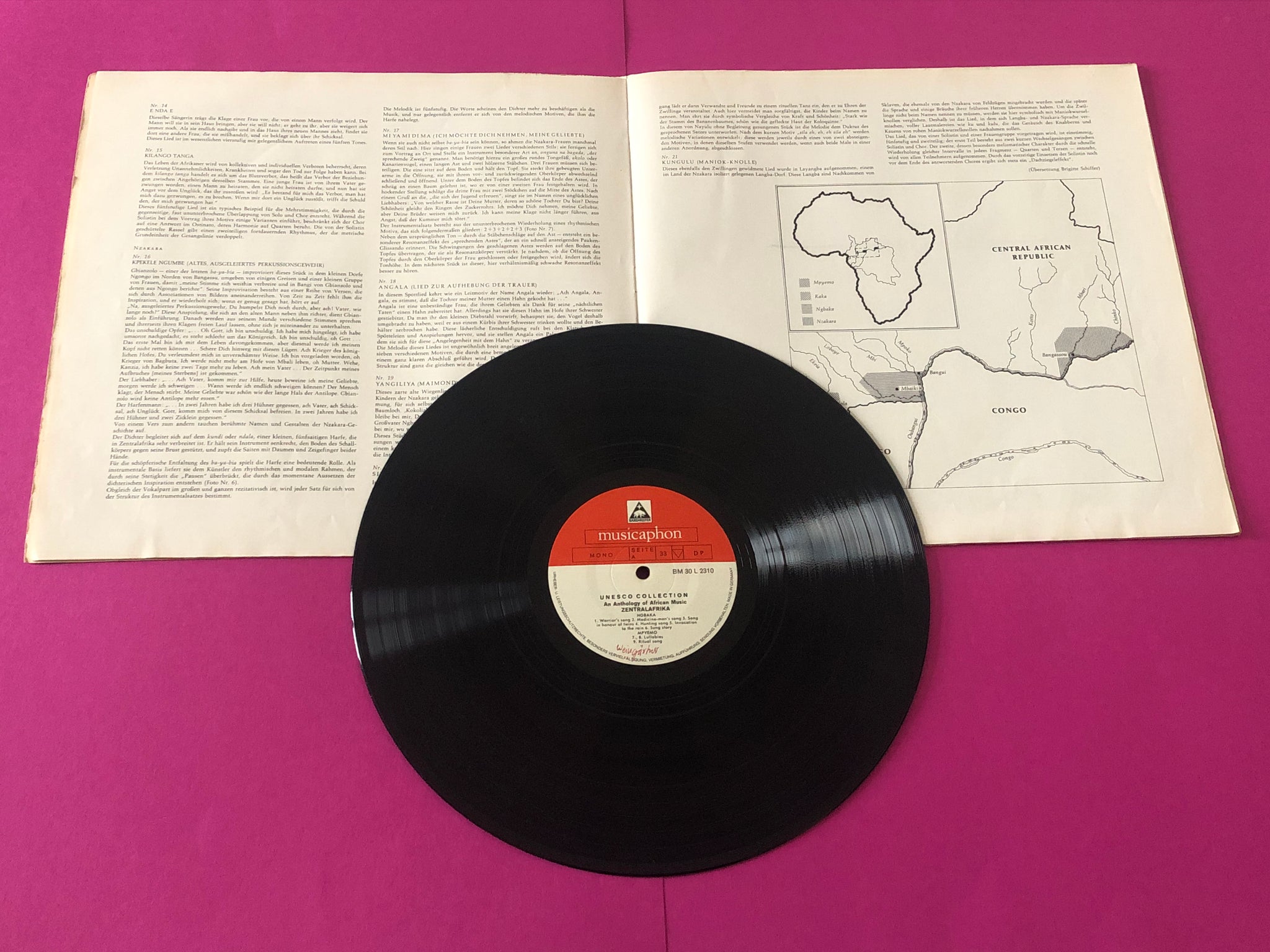 Edited for the International Music Council by the International Institute for Comparative Music Studies and Documentation in collaboration with the Royal Museum of Central Africa, Tervuren Musics of the Central African Republic The material was collected in 1964 and 1965 during field research organised by the Department for Folk Art and Tradition of the Musée National Barthélémy Boganda in Bangui, Central African Republic. Timing: Seite [= side A: 24'37" / Seite [= side B: 24'32" Frontispiece: Fetishes in honour of twins Made in Germany [on labels Gatefold cover with 16-page stapled booklet, including English, French & German notes Stamped runout information